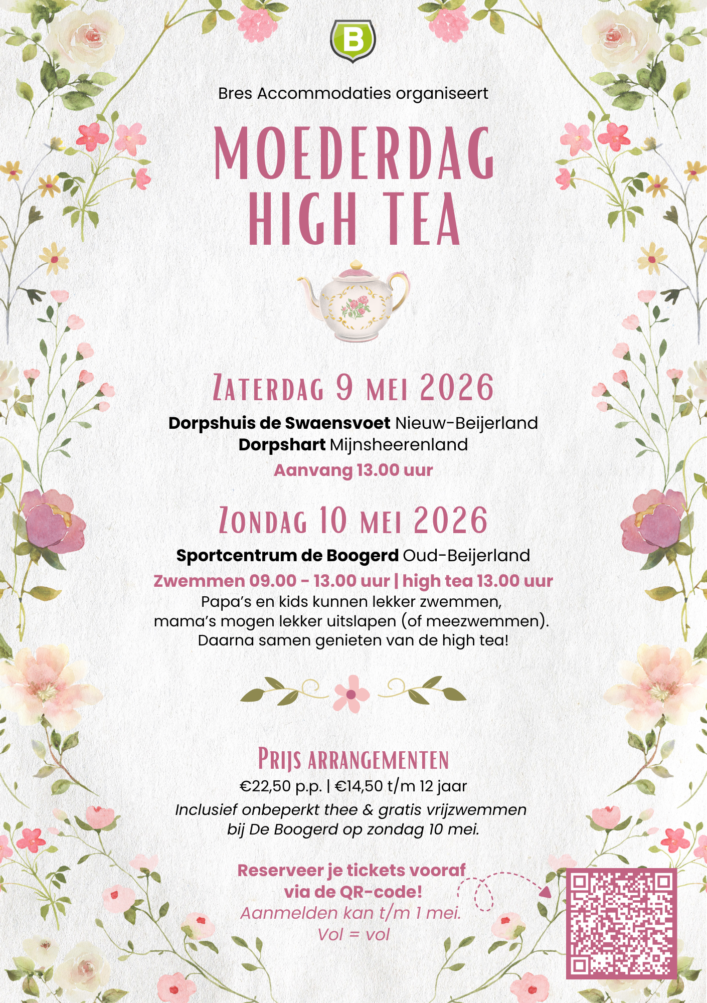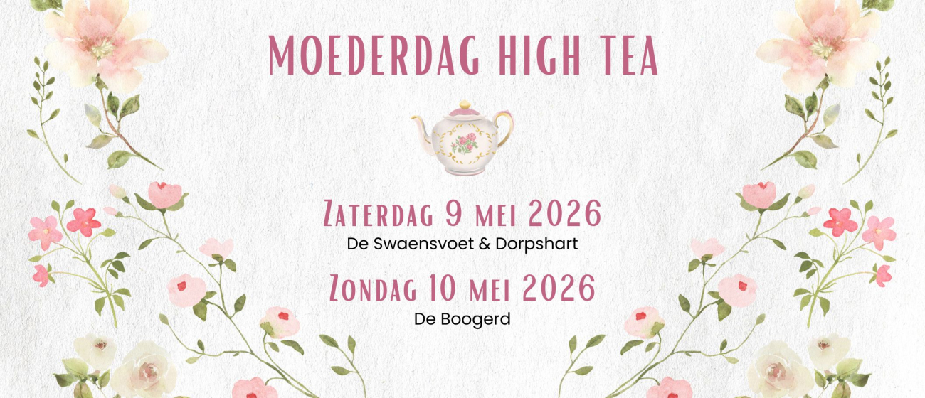 Bij De Swaensvoet in Nieuw-Beijerland en Dorpshart in Mijnsheerenland staat de high tea om 13.00 uur klaar. Geniet van een gezellige middag met zoete en hartige lekkernijen en natuurlijk onbeperkt thee. Extra leuk: bij deelname aan de high tea mag je op vertoning van je bevestigingsmail komen vrijzwemmen bij Sportcentrum de Boogerd op zondag 10 mei. Zo kun je er een compleet Moederdagweekend van maken!