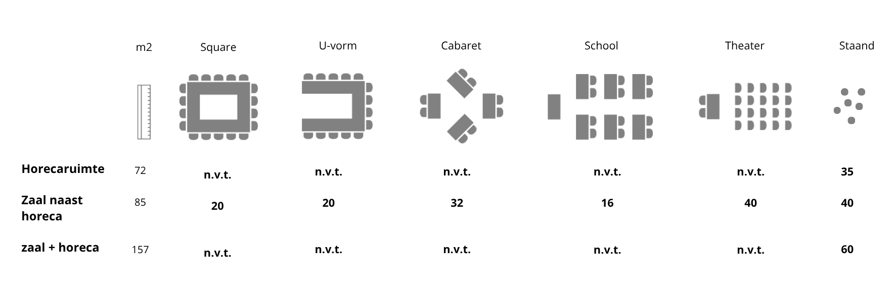 De deuren tussen de horecaruimte en de zaal kunnen worden geopend, waardoor je één grote ruimte krijgt die geschikt is voor maximaal 60 personen. Deze opzet is ideaal voor grotere evenementen zoals vergaderingen, presentaties, of grotere feesten. De open ruimte zorgt voor een aangename sfeer en voldoende ruimte.